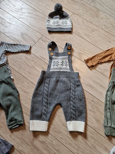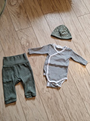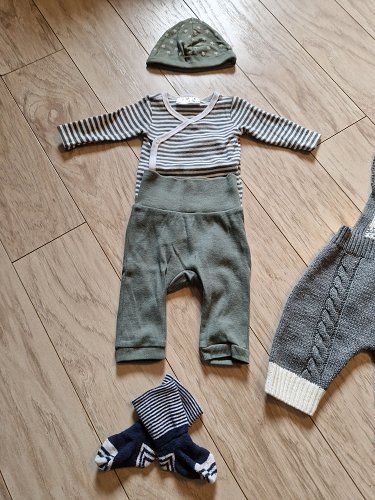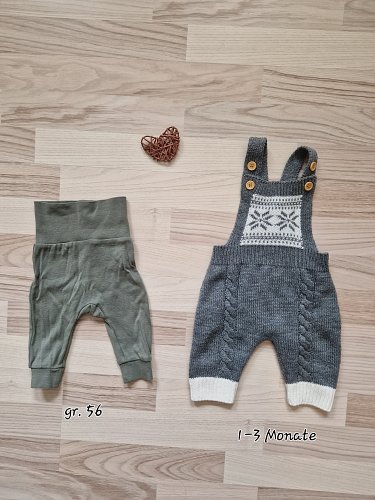 1 Body gr. 62 von H&M (braun) 1 Set gr. 56 (Mütze, Body und Hose) von Ergee (grün) 1 Hose von H&M (grün) 1 Strick Latzhose 1-3 Monate plus Mütze Mehr als 18 Paar kleine Babysocken 10 Strumpfhosen verschiedene Größen 7 Schnuller (alle unbenutzt)