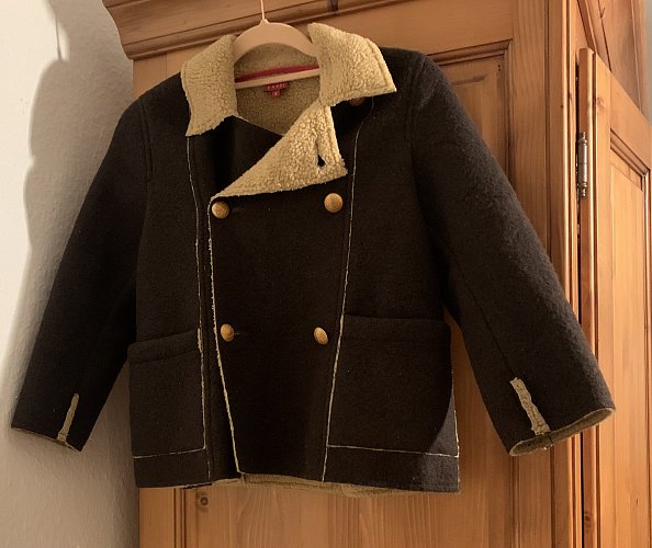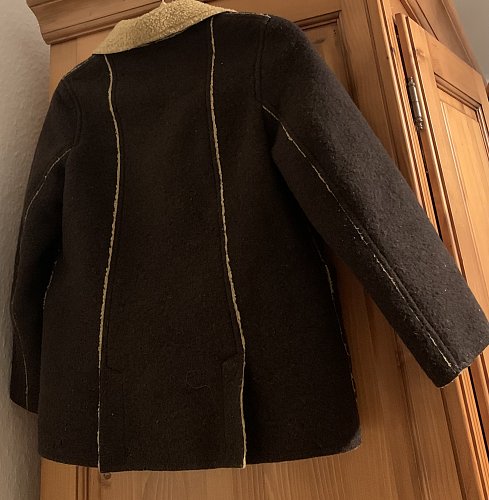 Warme Winterjacke von Karpi ,dunkelbraunem Wollstoff, innen ist sie komplett mit beigem Teddyfutter gefüttert – superweich, kuschelig und perfekt für kalte Tage