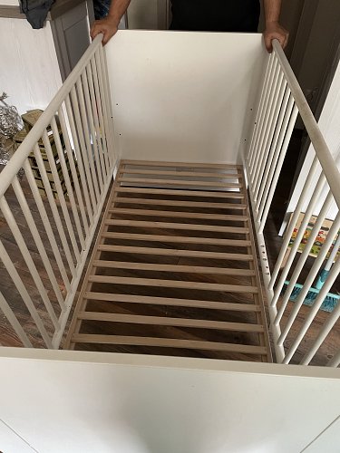 Wir geben unser Kinderbett ab. Es ist bereit für die nächste Runde. Hat Stäbe zum raus machen. Es wird abgegeben mit Lattenrost, aber ohne Matratze! NP war 179,99€