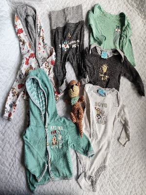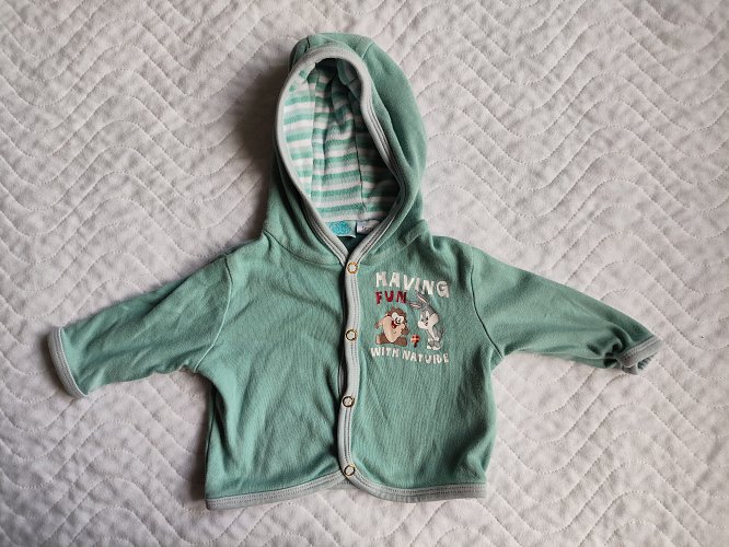 Ich biete zum Verkauf das abgebildete Kleidungspaket von den Looney Tunes in der Größe 50 an. Das kleine Paket besteht aus 2 dünnen Sweatjacken mit Kapuze, 3 Langarmbodys und einer Pumphosen. Von der Größe her passen die Teile eher mit Größe 50. Alle Teile befinden sich in einem guten bis sehr guten Zustand, keine Löcher oder Flecken. Alle Druckknöpfe sind intakt. Lediglich ein paar Aufdrucke haben die ersten Risse (siehe Bilder). Ich habe auch noch weitere Baby- / Kleinkindsachen im Angebot, schaut doch gerne mal rein :) Wir sind ein Nichtraucherhaushalt und unser Hund haart nicht (Allergiehund). Versand ab 5 Euro Einkaufswert. Versandkosten werden vom Käufer getragen. Auf Wunsch Versand als Großbrief, BüWa oder unversichertes Päckchen je nach Paketgröße ggfs. möglich. Bei unversichertem Versand haftet der Käufer selbst bei Verlust der Ware. Da es sich um einen Privatverkauf handelt, keine Rücknahme und keine Garantie. Ich schließe jegliche Sachmangelhaftung aus.