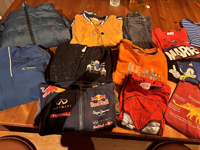 Hallo, es sind zwei Jacken dabei (eher Übergangsjacke) - von Zara und Vaude. Dann haben wir drei Strickenjacken abzugeben. Eine Hose (die ein Loch hat, war für KiTa oder draußen super). 9 Langarmshirts (eins hat ein kleines Loch, siehe Foto 4) 4 Pullis ( gut erhalten sind). Zusammen für 15€ Je Pulli 1,50€ Hose zu verschenken. Langarmshirt 0,50 je Teil, außer das mit dem Loch zu verschenken. Je Stickjacke 2€ Je Jacke 2,50€