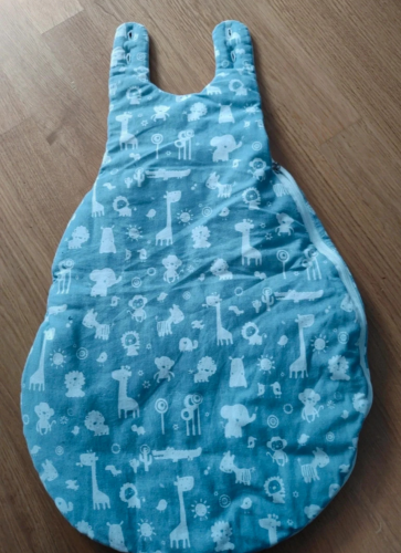 Selten genutztes Kugelschlafsack in Größe 50/56 in der Farbe Puderblau mit Innensack in Größe 50 in Creme.