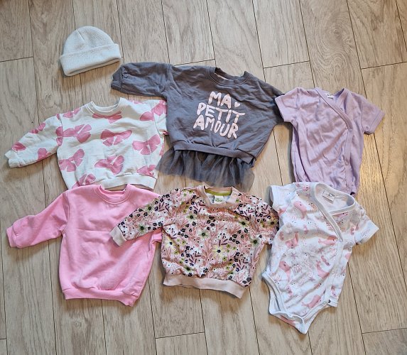 Verkaufe hier süße Baby-Kleidung in Größe 74. Das Set besteht aus: • 4 Pullovern in verschiedenen Farben • 2 Kurzarm Bodies • eine weiße Babymütze Verschiedene Hersteller