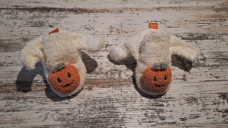 Ich biete hier ein Paar unglaublich süße, kuschelige Krabbelschuhe an, perfekt für die Herbst- und Halloween-Zeit! ​Details: ​Design: Cremefarbenes Teddyfell außen und innen, mit einem aufgestickten, orangefarbenen Kürbisgesicht (Jack O'Lantern) auf der Vorderseite. ​Marke: myggpp ​Verschluss: Einfacher Klettverschluss über dem Spann für guten Halt und einfaches An- und Ausziehen. ​Größe: 17,5/18 (entspricht einer Fußlänge von ca. 10,5 cm) ​Material: Weiches Teddyfell (vermutlich Polyester). ​Zustand: Gebraucht, aber dennoch gut erhalten. ​Wichtige Informationen ​Bezahlung: PayPal ist möglich. ​Versand: Der Versand ist gegen Aufpreis möglich. ​Hinweis: Dies ist ein Privatverkauf. Deshalb sind eine Rückgabe sowie jegliche Sachmängelhaftung ausgeschlossen.